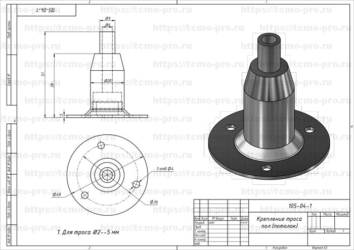 Крепление предназначено для троса Ø 2--5 мм. Крепится к полу (потолку) тремя шурупами. Без возможности регулировки натяжения троса.