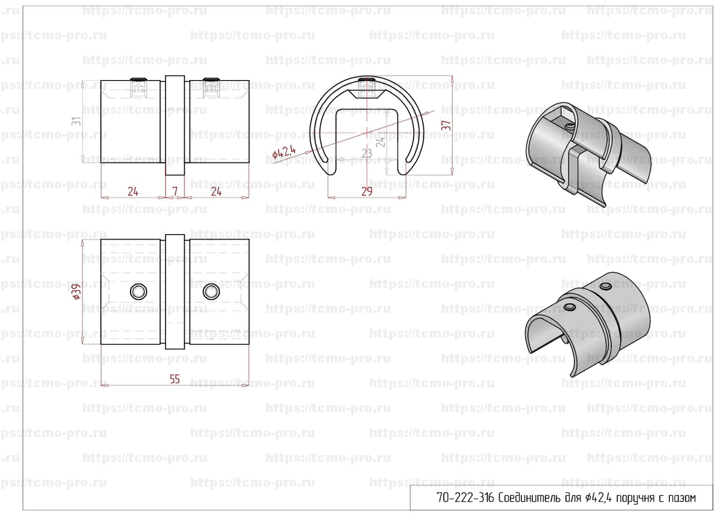 PR70-222-316 Соединитель для поручня с пазом d42.4 мм